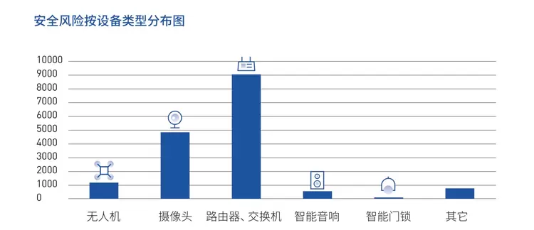近年来,智能家居市场发展十分迅猛,智能摄像头、智能音箱、智能门锁等智能家居设备影响着越来越多的家庭生活。《白皮书》显示,本次样本检测共发现16508个安全风险,其中智能家居设备存在的安全风险数量最多,且单个设备平均安全风险数量按照类别划分,由高到低为智能音箱、摄像头、路由器/交换机、无人机、智能门锁。