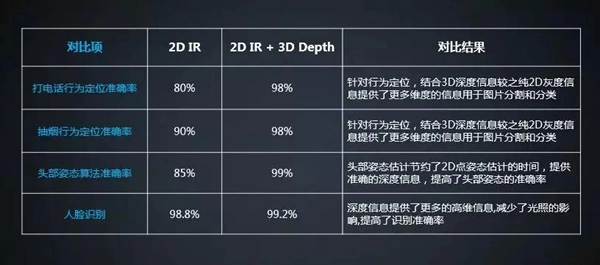 例如在2D图像基础上,驾驶员打电话、抽烟行为定位准确率仅为80%、90%,而3D深度信息则可提供多维度数据用于图片分割和分类,打电话及抽烟行为定位 准确率可提升至98%。
