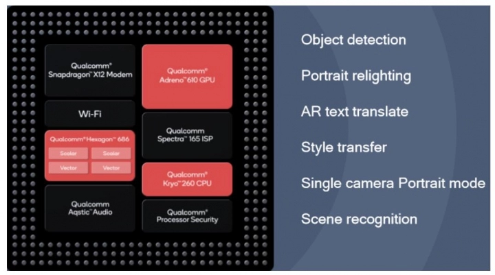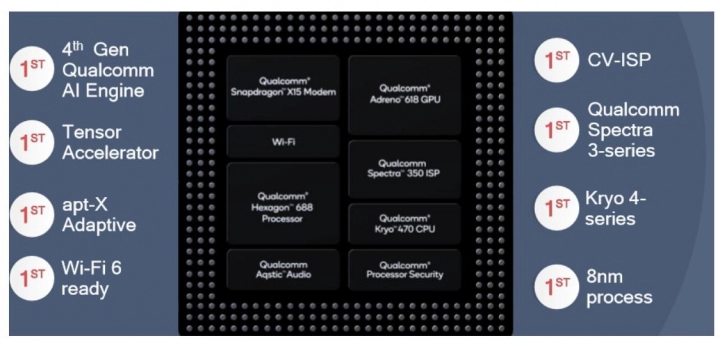二是AIE采用了高通Hexagon 688 DSP,Adreno 618 GPU以及高效的先进8nm Kyro 470 CPU,其处理能力比前代产品快2倍。
