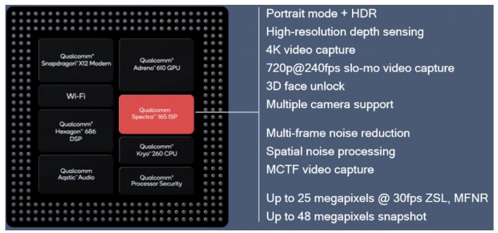 在成像方面,骁龙730拥有第一个适用于7系列基于计算机视觉的图像信号处理器(CV-ISP);此外,Spectra 350采用CV-ISP,支持高级成像功能,如纵向模式下的4K HDR视频,可实现60fps的深度感应,物体分割,Cinemagraph视频,高清慢动作视频@ 960fps,以及近4倍的省电功能。另外,骁龙730还支持新一代HEIF压缩格式,可以节省几乎一半大小的照片,视频和CV数据。