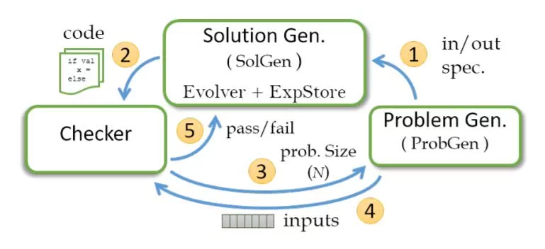 一旦解决函数构建出来,就会执行这个函数,使用Python的exec()函数生成输出结果。检测器负责检查输出,判定接受或拒绝输出。如果第一个输出被接受,则使用问题生成器生成的更多不同大小的、与输入测试相同的解决函数。如果检测器接受了所有测试,则该解决函数即被声明为该问题的解决方案。上述三个阶段构成了一个循序渐进的步骤。