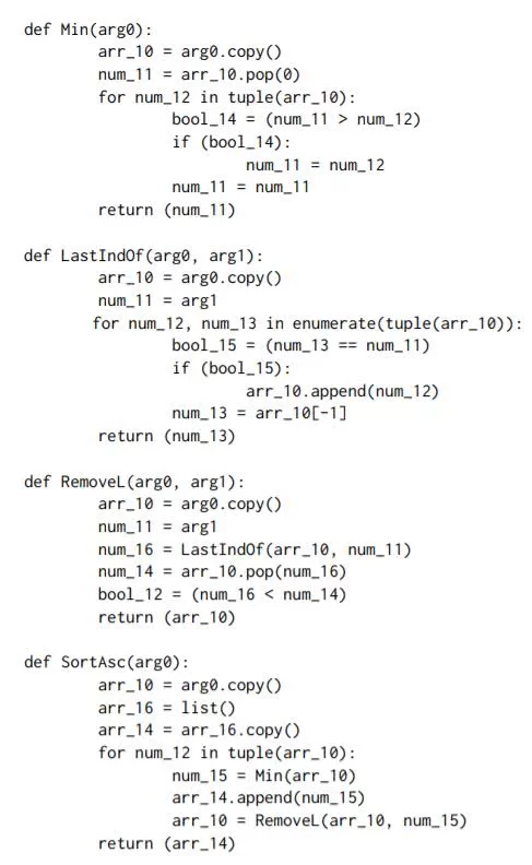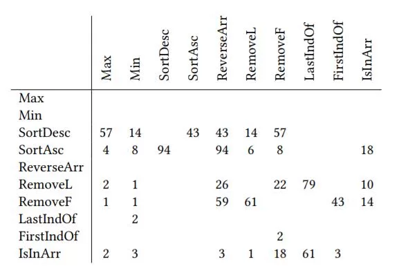 上表所示为在问题集A中的调用者-被调用者的关系。比如SortDesc函数所在的行显示,SortAsc在57%的解决方案中调用了Max函数,在14%的解决方案中调用了Min函数,以此类推。Min,Max和ReverseArr函数没有调用任何其他函数。所有其他函数都依赖于一个或多个函数来得到解决方案,显示出函数组合的重要性。