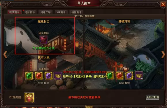 单人副本的剧情副本中,第一关是激战村口,其次是集市大战及牌楼对决。杨露禅为什么在村口发生冲突,与陈家沟的人进行一场激战?想拜师,又不能擅入,自然是要动武才能解决了。原来傲天太极崛起打架还有奖励可以拿,包括集市大战,首次通关会奖励一些宝石和绑定元宝。