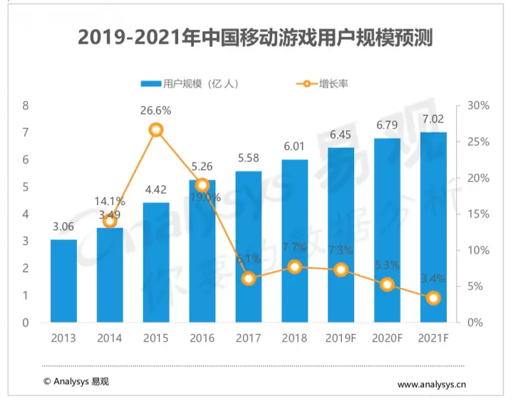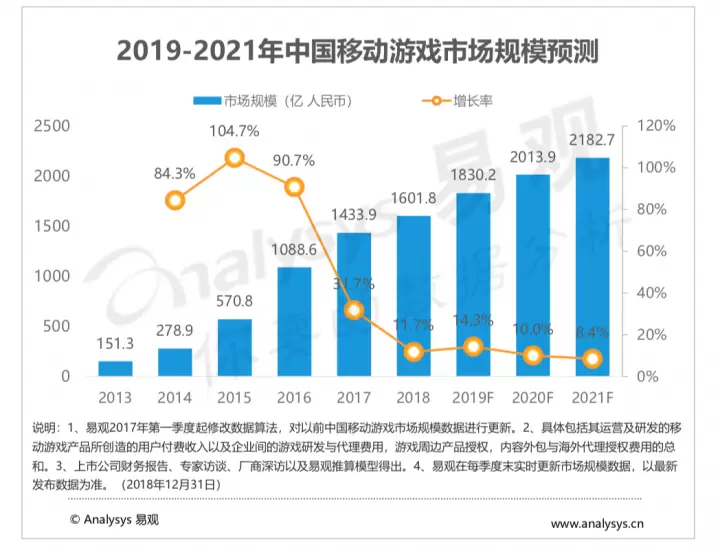 从报告上看,2018年中国移动游戏的整体情况是,市场规模为1601.8亿元人民币,增长率为11.7%,预计20121年将达2182.7亿元人民币, 增长率为8.4%。用户规模为6.01亿人,增长率为7.7%。预计20121年将达7.02亿人,增长率为3.4%。