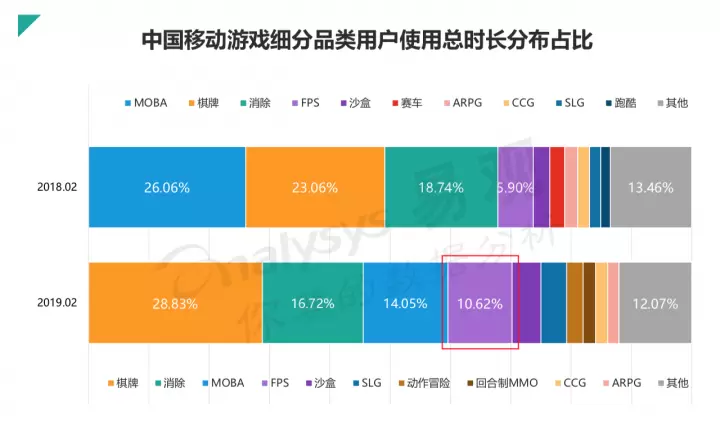 同时,用户的精品化要求还建立在了多元化的基础上。Analysys易观千帆数据显示,与去年同期相比, 2019年2月的用户使用总时长分布有了不小的变化,不仅细分品类排名出现更替,更出现了此消彼长。这在一方面体现了移动游戏市场的快速变化,前三大品类的占比从67.86%下降 至59.7%,用户的喜好分布更加多元化。