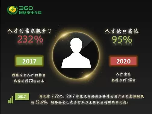 作为本次大会嘉宾,360网络安全学院李洋介绍,2017年,网络安全人才的缺口已达70万以上,这一数字在2020年将会增长到140万。