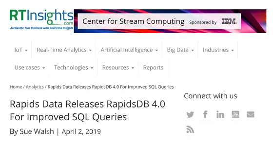 国际知名科技媒体人Sue Walsh在RTInsights上拟文 《Rapids Data Releases RapidsDB 4.0 For Improved SQL Queries》,表示全内存分布式数据库RapidsDB v4.0 用简单的SQL语句实现了数据库的复杂查询,从大数据平台开发与应用的角度来看,使得操作与实施门槛得以进一步降低,也让大数据技术能够更加迅速地切入金融、能源等更多业务领域,实现大数据产品的快速部署。