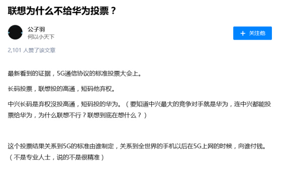 根据帖子表述,在3GPP举办的有关5G标准的表决会议上,联想针对5G标准的Polar短码方案投票(该方案由华为等企业主导),做出了弃权。