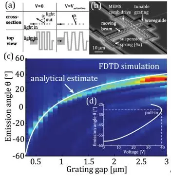 图1(a)展示了这款MEMS可调谐光栅驱动前后的工作原理。(b)这款MEMS器件的扫描电子显微镜(SEM)图像。光栅作为软弹簧的一部分,通过梳齿驱动执行器拉伸,改变光栅齿之间的间距。(c)光栅齿间距增加对光束转向影响的模拟结果(颜色:发射光强度)叠加分析估算(白线)。(d)梳齿驱动执行器件的分析致动估算。