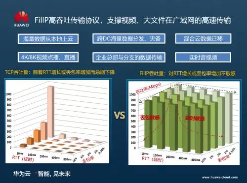 华为云CDN及视频服务CTO表示,通过FillP高吞吐传输协议可支持视频、大文件的高速传输,该协议是针对大块数据传输设计的可靠流传输协议,在高延时和高丢包场景下比标准TCP协议快近百倍。