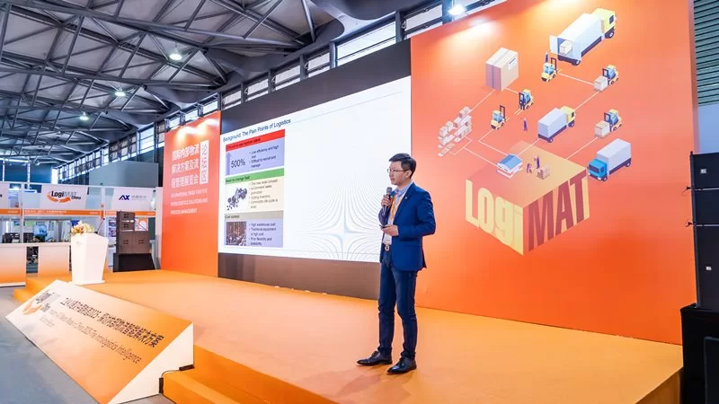 Geek+联合创始人及产品副总裁刘凯在LogiMAT上进行产品发布