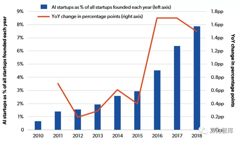 自2016年以来,人工智能技术的提升触发新的创业浪潮,以人工智能为主导的初创企业激增。人工智能走向成熟的的推动因素包括:提供改进结果的增强算法,加速人工智能系统训练的专用硬件,以及更有效的训练数据。
