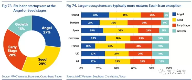 通常,拥有大量人工智能公司的国家(英国、法国和德国)通常拥有更成熟的生态系统(如上图右)。在英国、法国和德国,20%的人工智能初创企业属于“成长型”企业,在瑞典,只有10%。西班牙是个例外,尽管西班牙的人工智能公司几乎和德国一样多,但成熟的公司只有10%。