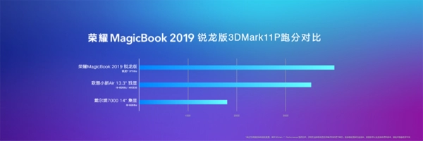 性能跑分是一台笔记本综合性能的最直观表现,以3DMark 11软件在P模式下的跑分为例,荣耀 MagicBook 2019锐龙版R7版本跑分高达4142,R5版本跑分高达3841。得益于工程设计师们对于架构和散热的综合设计,让AMD APU充分发挥出性能。