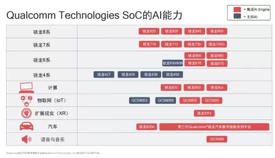 就在本月,高通又宣布了面向高端和中端市场的全新骁龙7系和6系全新平台。骁龙730和730G移动平台集成了多项过去仅在骁龙8系支持的技术,实现了全新体验升级,这其中就包括第四代多核AI Engine,它提升了拍摄、游戏、语音和安全的终端侧直观交互的处理速度,AI算力是前代平台骁龙710的2倍。除智能手机外,面向移动计算、XR、物联网、音箱和汽车,高通也都已经推出集成其人工智能引擎AI Engine的产品平台。
