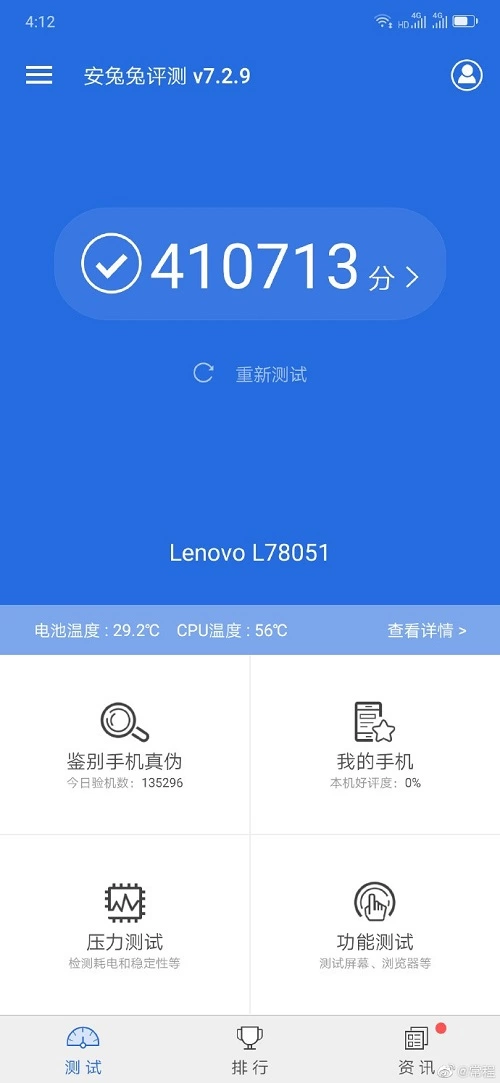 从联想方面爆出的跑分图上看,联想Z6Pro安兔兔跑分超过41万分!可以说相当亮眼,这个成绩也足以让联想站在主流旗舰第一序列。联想Z6Pro还会拥有4000mAh的电池容量,性能续航双重保障,满足用户用机的多种需求。