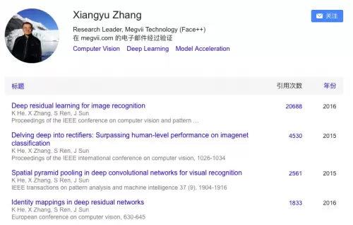 截止4月18日,张祥雨与导师孙剑于2016年共同发表的一篇论文《用于图像识别的深度残差方法》,总计被全球学者引用20688次。在论文中,张祥雨介绍了一种能够减轻神经网络训练负担、同时增加网络深度的模型,该模型在ILSVRC(ImageNet)、COCO2015(COCO)图像识别竞赛中获得多项冠军。
