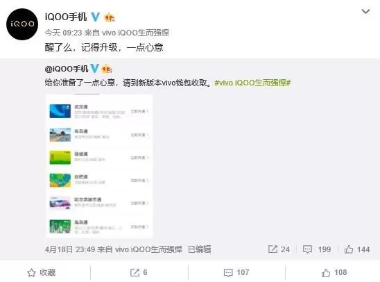 iQOO手机官微昨晚发布微博称:“给你准备了一点心意,请到新版本vivo钱包收取。”更调皮的是,iQOO手机官微今日早上还转发这一微博,并表示:“醒了么,记得升级,一点心意。”