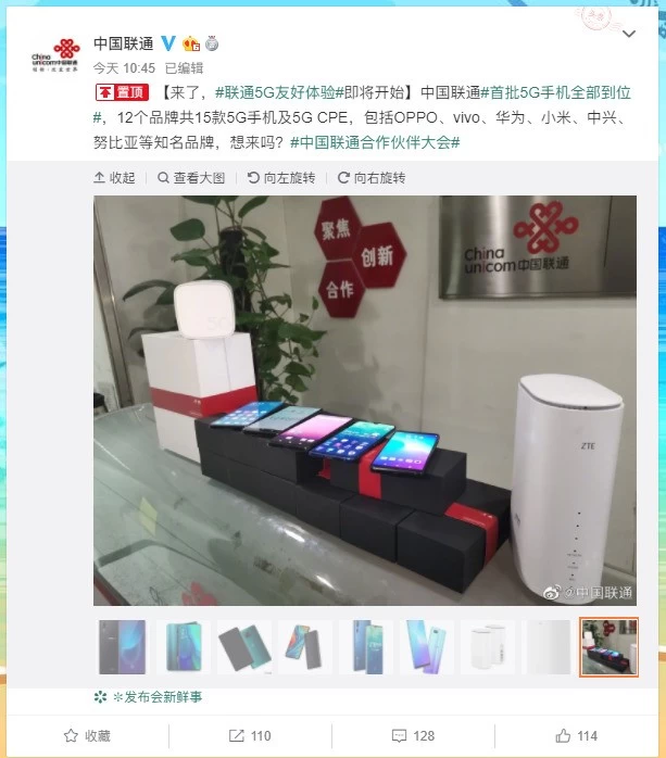 本月月中,中国联通就曾宣布,“中国联通首批5G手机全部到位,12个品牌共15款5G手机及5G CPE,包括OPPO、vivo、华为、小米、中兴、努比亚等知名品牌。”结合之前的信息,这些手机将包含vivo NEX5G、OPPO Reno5G、华为Mate 20X 5G、小米MIX 35G、中兴Axon 10 Pro5G等等。