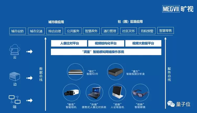 云、边、端三者构成了旷视的城市大脑综合性解决方案,分别通过两条总线向不同的子业务场景提供服务。