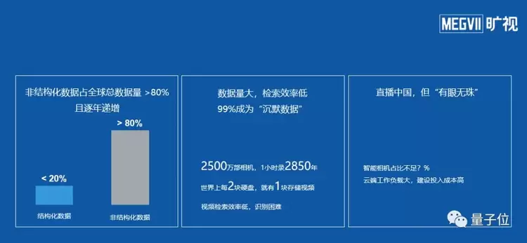 第二组数字:以视频为例,2016年至今,公安自建的城市监控摄像机共有2500万部,一个小时可以录下2850年的视频,这个数据量是非常大的。以硬盘为例,在全世界所有硬盘中,每2块硬盘就有1块存储视频。