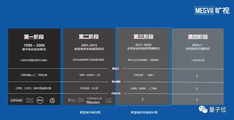第二个阶段是2001年到2011年这十年,实现了各个业务垂直领域整体的信息化管理和监控化。这个过程有两个主要的驱动力,一个是分布式系统,一个是数据库。原始数据不断汇集和沉淀,为智慧城市的萌生打下了基础。