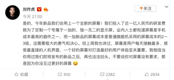 屏幕对于一款手机产品至关重要,刘作虎表示:“我们投入了近一亿人民币的研发费就为了定制一个专属于一加的、独一无二的显示屏。业内人士都知道屏幕是手机成本最高的器件之一,而一加新品的屏幕成本是普通旗舰机采用的屏幕的成本2-3倍。”