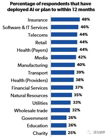 行业内的差异也十分明显。已经或打算在未来12个月内采用人工智能的保险公司比例,比其他金融服务公司高出10个百分点。在医疗保健领域,付费者与人工智能的接触比提供者更多。特定AI技术的价值和适用性使得部门内出现应用热点。