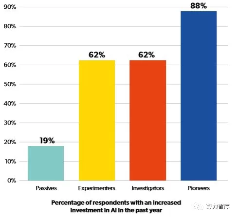 与此同时,领先者(下图“pioneers”和“investigators”)正在以比落后者更快的速度增加对人工智能的投资,从而增强自己的竞争优势。在人工智能部署的前沿,90%的人工智能先驱者公司在过去一年增加了对人工智能的投资。在没有采用人工智能或对人工智能了解不多的公司中,只有五分之一的公司增加了对人工智能的投入。