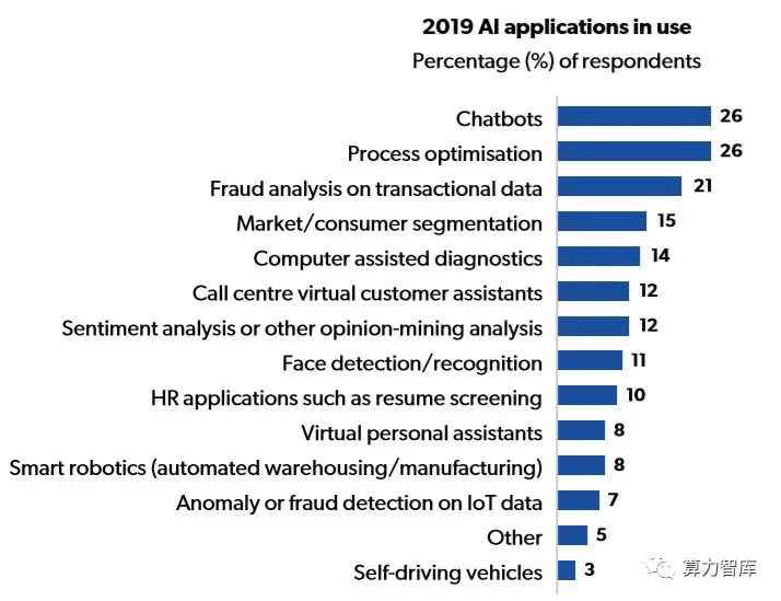 自然语言处理和计算机视觉人工智能支撑着许多流行的人工智能应用,包括聊天机器人、计算机辅助诊断、情绪分析和人脸检测。2019年预计最受欢迎的应用为聊天机器人和过程优化,基于数据的欺诈分析也在21%的受访公司中得到应用。
