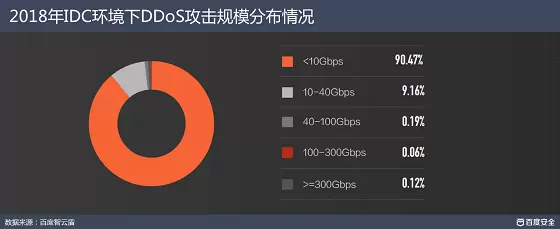 事实上,这一数字出现明显增幅的原因与其背后DDoS攻击规模的变化有关。根据百度安全的监测显示,2018年,在百度智云盾覆盖的全国13个省区直辖市和4个海外地区的IDC节点中,累计检出DDoS攻击超过9万起,其中10Gbps以下占比90.47%,超过100Gbps占比0.18%。