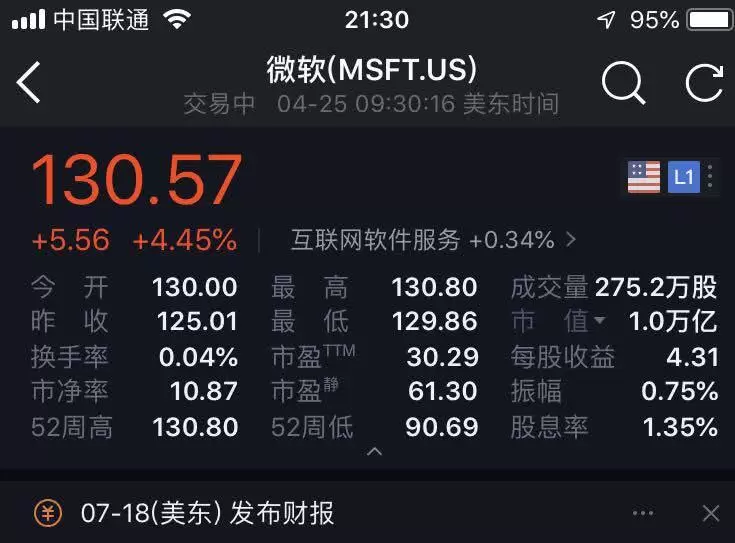 4月25日消息,微软股价开盘涨4%,报130美元,创历史新高,市值破万亿美元,超过苹果,成为全球市值最高的公司。