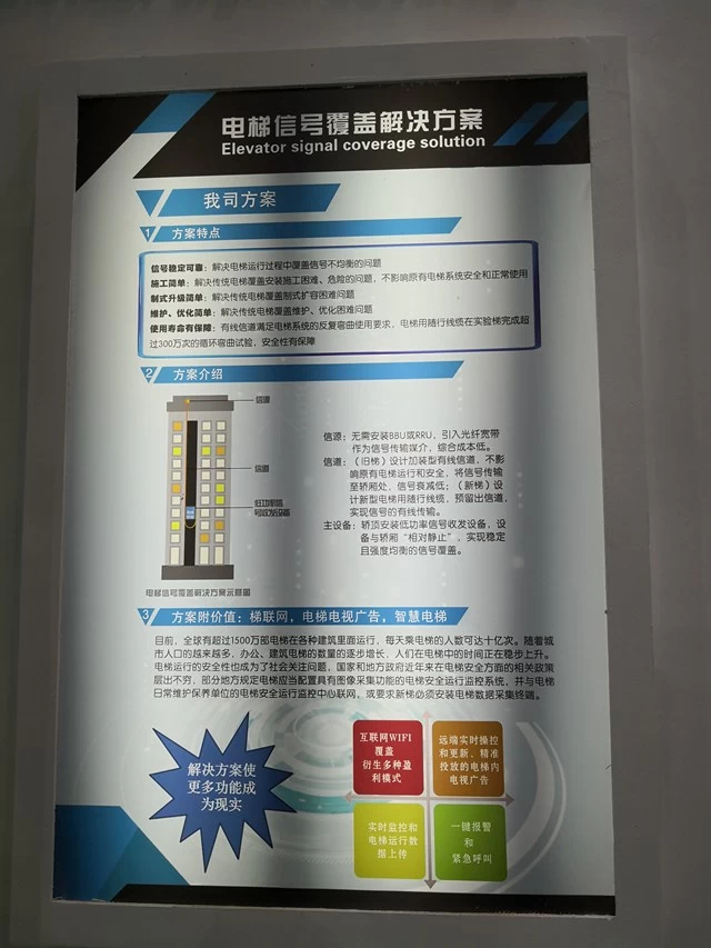 “基于我们的电梯无线信号覆盖解决方案,可以做到电梯监控视频、运行数据的实时上传,令远程管控、提前预警成为可能;万一出现电梯困人事件,也可通过一键报警和紧急呼叫减少二次伤害。”他表示,在解决安全隐患的同时,该方案还具有广阔的周边应用前景、将带来新的盈利模式,例如轿厢内的视频广告在线推送。