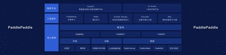 而在服务平台层面,飞桨提供了零基础定制化训练和服务平台EasyDL和一站式开发平台AIStudio,通过完善的工具与服务容纳,将真实产业需求与AI能力连接在一起。