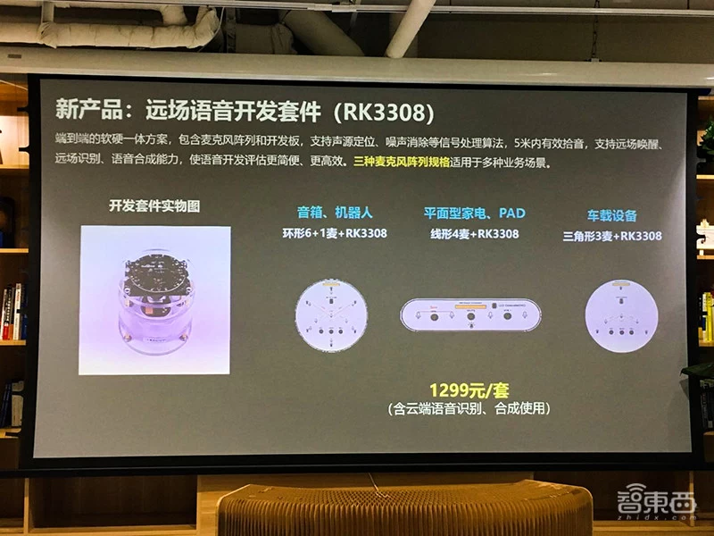 紧接着,百度展示了一组新产品——远场语音开发套件RK3308,三款麦克风阵列规格适用于多种业务场景,包括音箱、机器人、平面型家电、PAD、车载设备等。
