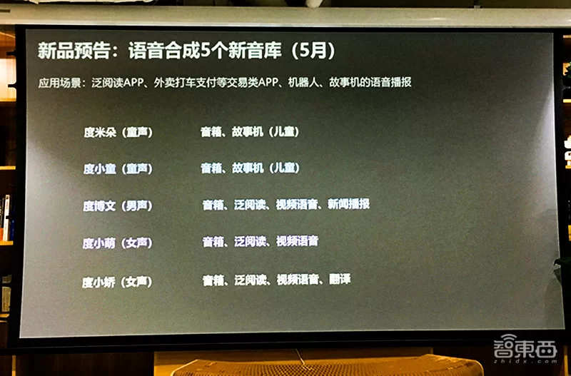 百度还提前预告了将在5月发布的新品,包括语音合成5个新音库和呼叫中心语音解决方案。