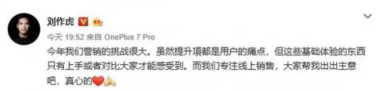4月27日晚间,一加科技CEO刘作虎发布微博称:“今年我们营销的挑战很大。虽然提升项都是用户的痛点,但这些基础体验的东西只有上手或者对比大家才能感受到。而我们专注线上销售,大家帮我出出主意吧。”并在评论区回复称“今年我们拓展一些线下体验的地方。”或许意味着,一加将在今年建设线下体验店。