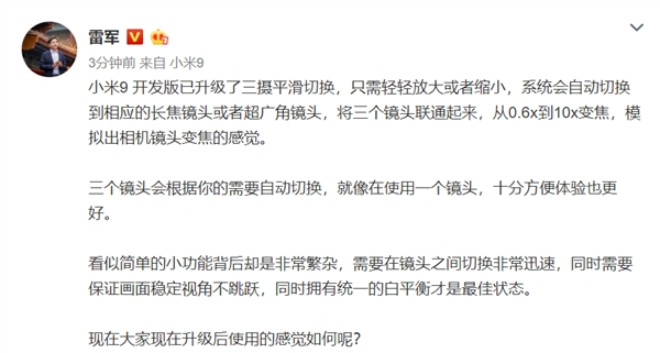 - 雷军再开微博发布会 小米9升级新功能:三摄平滑切换