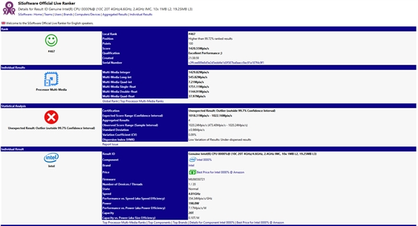 近日,SiSoftware数据库内出现了一款Cascade Lake-X家族的新品,暂无型号,规格上为10核心20线程、19.25MB三级缓存、4.0GHz基础频率、4.6GHz睿频加速频率。