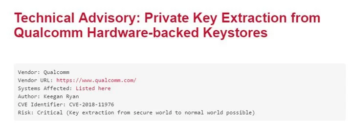 此一编号为CVE-2018-11976的漏洞,涉及高通芯片安全执行环境(Qualcomm Secure Execution Environment,QSEE)的椭圆曲线数码签章算法(Elliptic Curve Digital Signature Algorithm,ECDSA),将允许黑客推测出存放在QSEE中、以ECDSA加密的224位与256位的金钥。