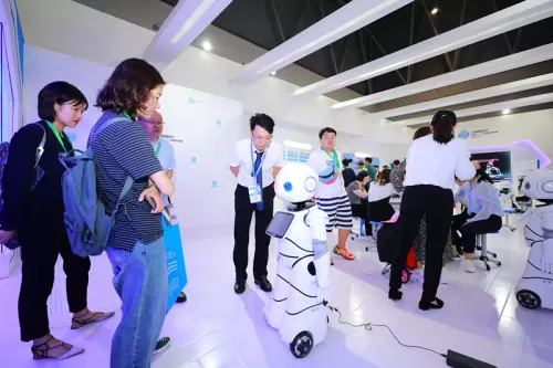 呆萌可爱、能唱会跳、机智过人,机器人优友引发了记者的兴趣。据工作人员介绍,这是中国第一台量产下线的商用类人型服务机器人优友,曾参与天津全运会开幕式、金鹰节颁奖晚会、CCTV网络春晚等重大活动和节目,是服务机器人里的“大明星”。不过,这次优友并不是主角,而是为其“小兄弟”小智站台,小智看上去像优友的缩小版,运用康力优蓝国际级服务机器人量产能力,用商用级的技术做教育,同时首创智能机器人仿生器官级模块化拆解,用真正的智能机器人承载AI核心内容。