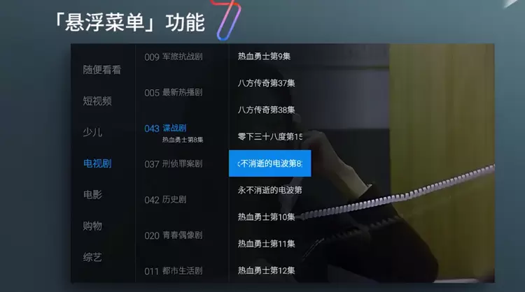 悬浮菜单则拥有全网唯一无需退出当前观看节目即可换台的电视交互方式,将节目及相关内容用悬浮于当前节目的呈现形式,让用户边看边点。