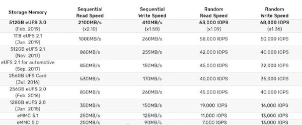 近日,XDA人士爆料一加7 Pro将会搭载UFS 3.0闪存,而且其上市时间非常有可能会早于三星折叠屏手机Galaxy Fold。所以,一加7 Pro有望成为首款搭载UFS 3.0闪存的上市销售机型。按照三星公布的测试数据,UFS 3.0闪存(512GB容量)的顺序读取速度为2100MB/s、写入速度为410MB/s,随机读速63K IOPS、写速68K IOPS,较UFS 2.1(1TB)分别提升了1.1倍、0.58倍、0.09倍和0.36倍。