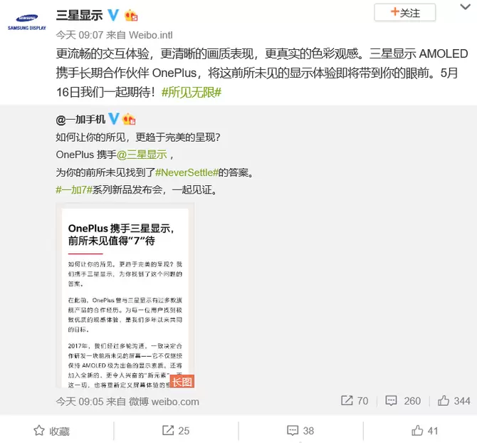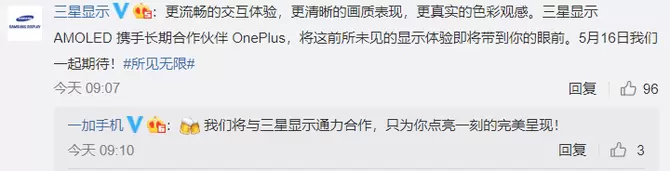 随后三星显示与一加互动,表示“更流畅的交互体验,更清晰的画质表现,更真实的色彩观感。三星显示AMOLED携手长期合作伙伴OnePlus,将这前所未见的显示体验即将带到你的眼前。5月16日,让我们一共见证。”