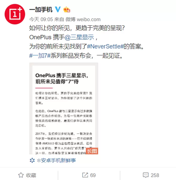 4月30日消息,一加手机发布微博表示,OnePlus携手三星显示为前所未见的屏幕找到正确的答案。