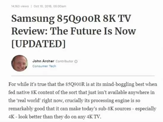 三星量子点8K处理器芯片(Quantum Processor 8K)对于画质的提升也受到了美国著名科技杂志《福布斯》的赞赏,该杂志称“三星QLED 8K电视能够提供令人难以置信的最佳显示效果,在目前原生8K内容缺少的情况下,三星量子点8K处理器芯片(Quantum Processor 8K)可以将今天低于8K的内容(特别是4K)看起来比任何4K电视都要好。”所以8K内容的缺失已经不再是8K电视普及的障碍。