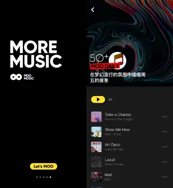 作为“新一代潮流音乐APP”, MOO音乐着重于音乐的播放及新音乐的探索,让听歌更多了随意感和多样性。MOO音乐坚持简易的交互、设计风格充满现代感,搭配特色的视频音乐背景,为用户打造更干净更纯粹的沉浸式音乐体验。