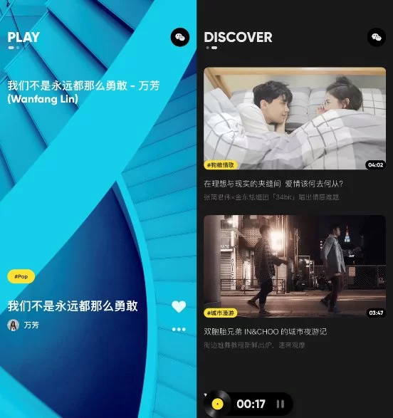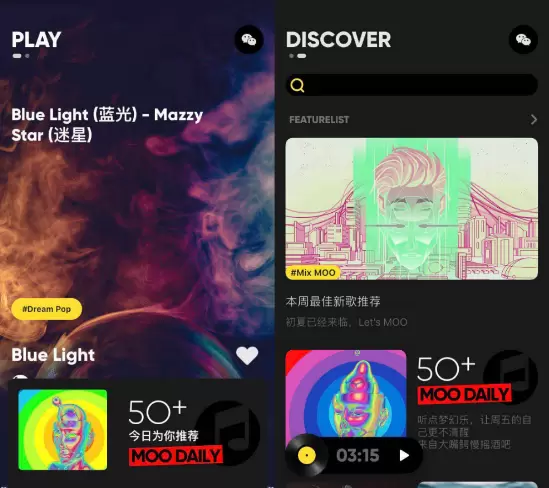 MOO音乐的PLAY页面(左)和 DISCOVER页面(右)