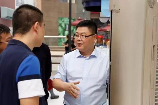 图片说明:美的空调副总裁刘涛向京东空调总经理薛有为介绍无风感系列产品