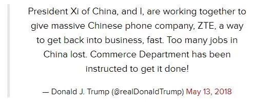 曙光来!特朗普发推特称正在为中兴提供快速恢复业务的途径